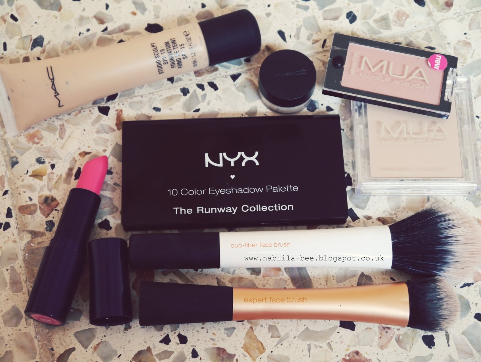 Bottom left to right: Miss sporty lipstick in 038 i love / NYX eyeshadow palette / Real techniques foundation and powder brushes